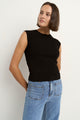 Woman wearing a fitted black ribbed knit tank top with a crew neckline, styled casually with high-waisted light blue denim jeans.