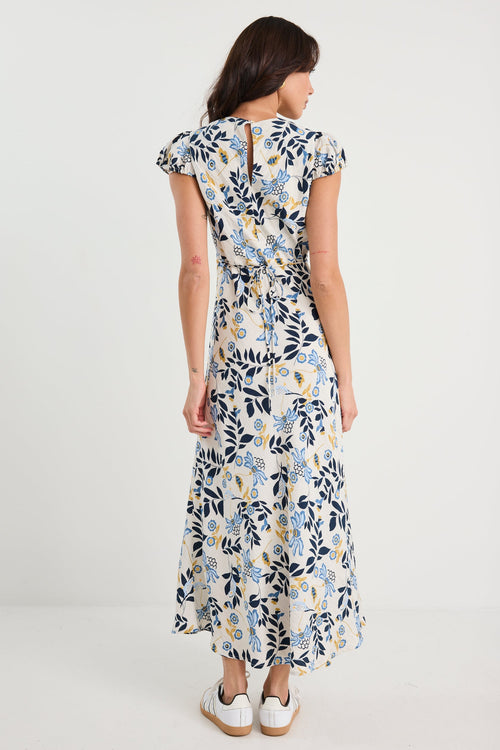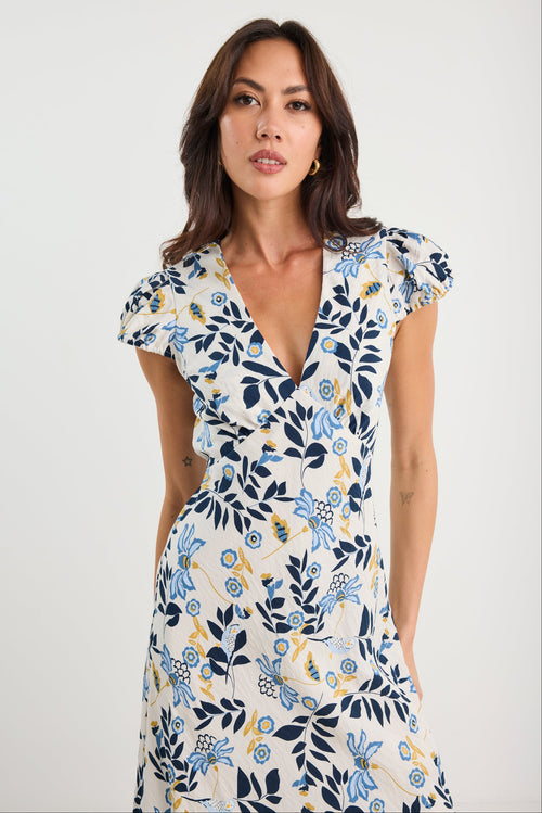 The Sweetie Dress is cut on the bias for a beautiful drape that skims the body, enhanced by soft cap sleeves and a flattering V-neckline. Its fresh floral print in blue and yellow tones adds a playful touch, while the maxi length keeps it versatile—perfect for both weekend outings and casual celebrations.