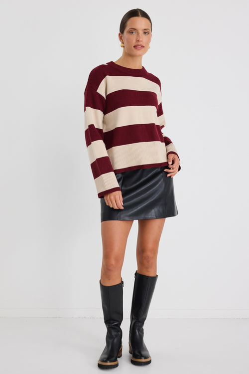 Model wears a black leather short mini skirt with stripe jumper