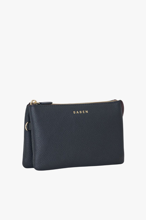 black leather crossbody bag with a pebbled texture and gold hardware. The compact silhouette features the brand name 'SABEN' embossed in gold at the centre. A detachable strap is clipped to each side, with a visible zip closure along the top edge