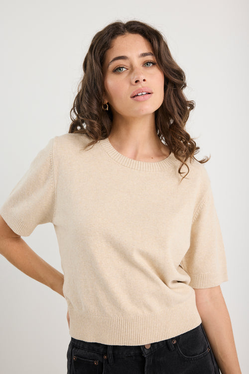 Soft, simple and beautifully refined, the Topic Knit Tee is an everyday luxury. Crafted from a cotton-rich cashmere blend, this short sleeve knit offers a relaxed silhouette with a fine, lightweight feel. The crew neckline and neatly finished trims lend a timeless touch, while the champagne tone makes it endlessly versatile for layering or wearing solo.