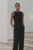 Woman wearing a black sleeveless textured top with a fitted silhouette and high neckline, paired with high-waisted denim jeans.