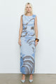 Model wears a fitted sleeveless midi dress in a custom blue and charcoal abstract print. The dress features a high boat neckline and flattering gathers through the sides. Styled with pointed heels and a chunky resin bangle for a minimal yet polished look.