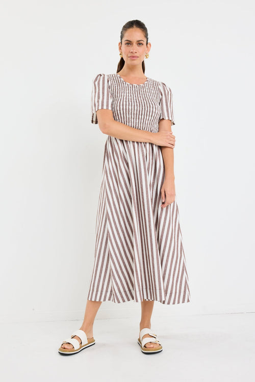 Wren Chocolate Stripe Cotton SS Shirred Bodice Midi Dress