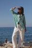 Woman wearing a green and white striped shirt and sunglasses by the ocean.