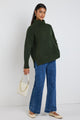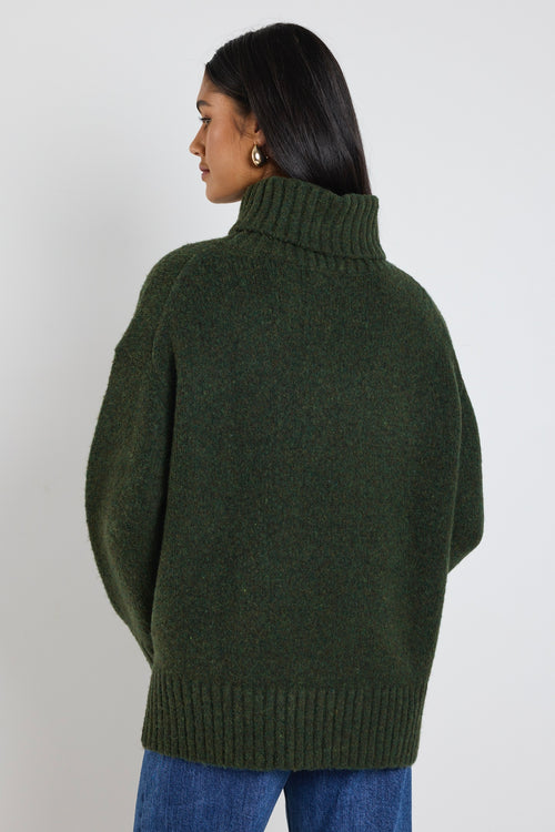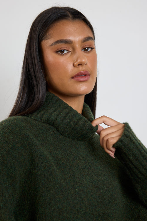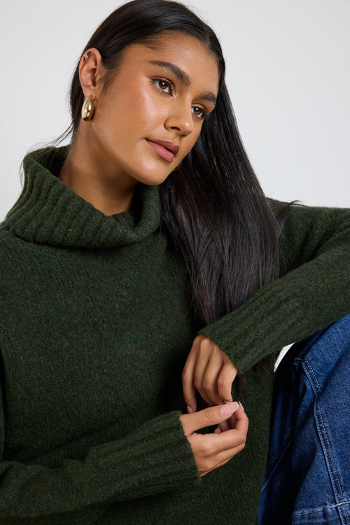 A woman wearing a dark green relaxed fit knit jumper with a high neckline and side split hem.