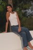 model wears  dark blue wide leg jean with a black tank top